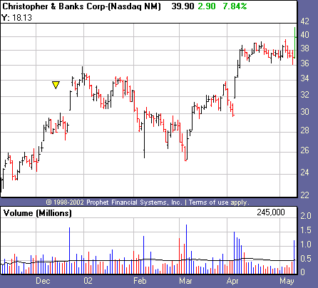 Christopher & Banks | ( CHBS | Quote | Chart | News | PowerRating) | 92 | 39.90 | + 2.90 | 503,900 | 33.60 | 39.25 |