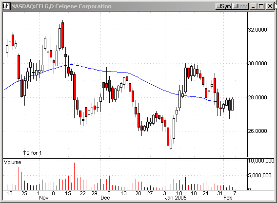 near the day’s high. Long CELG if it moves above 28. Our Target is near 30. Risk